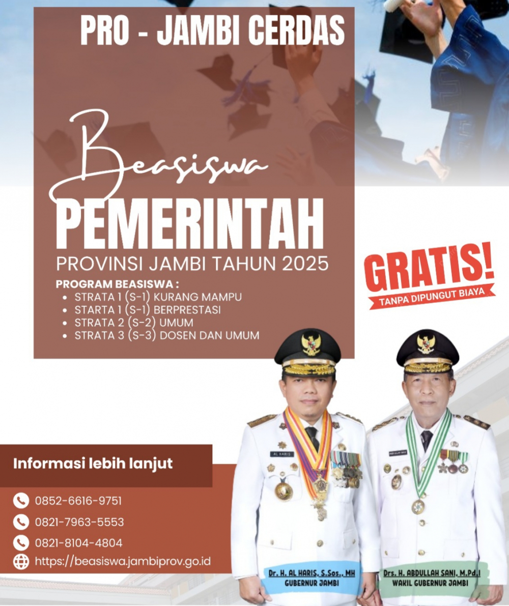 AKSATANEWS.COM-Pemerintah Provinsi Jambi dengan visi Jambi Mantap Berkelanjutan melalui Biro Kesramas Setda Provinsi Jambi kembali meluncurkan program Pro Jambi Cerdas untuk tahun 2025. Program beasiswa Pro-Jambi Cerdas menjadi pilar strategis yang mencakup bantuan biaya pendidikan bagi siswa kurang mampu juga siswa berprestasi untuk jenjang S1, S2, dan S3. PRO-JAMBI CERDAS adalah langkah berani untuk menciptakan masyarakat Jambi yang cerdas, kompetitif, dan siap menghadapi tantangan global.
